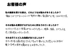 今までは痛みが出ると腰のあたりだけを施術してもらっていましたが、先生は腰を一度も触りませんでした。私の身体は股関節の奥深くと肩甲骨に腰痛の原因がある事を教えてくれました。こんな施術をするところは初めてだと思いました。